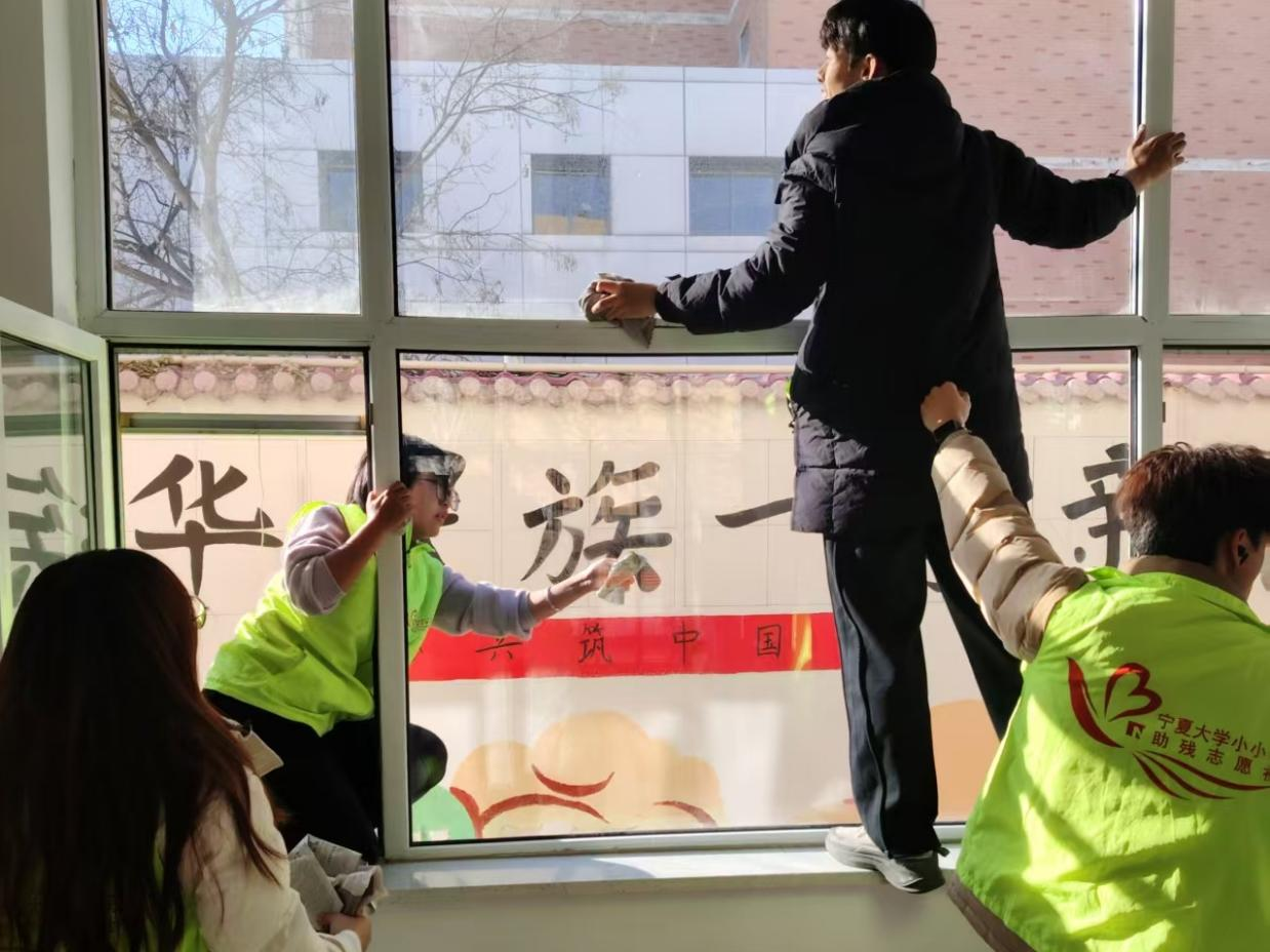 活动当日,志愿者们首先来到宁大社区,开展环境卫生整治服务。大家手持清洁工具,分工明确、积极配合,有的仔细擦拭宣传栏和玻璃窗,有的认真清扫公共区域和绿化带中的落叶杂物。尽管天气微寒,但同学们热情高涨,忙碌的身影成为社区中一道动人的风景。墙上“中华民族一家亲”的标语在阳光下格外醒目,与志愿者们的辛勤付出相互映衬,为冬日增添了几分暖意。经过一番努力,社区环境变得更加整洁有序,居民们也纷纷投来赞许的目光。