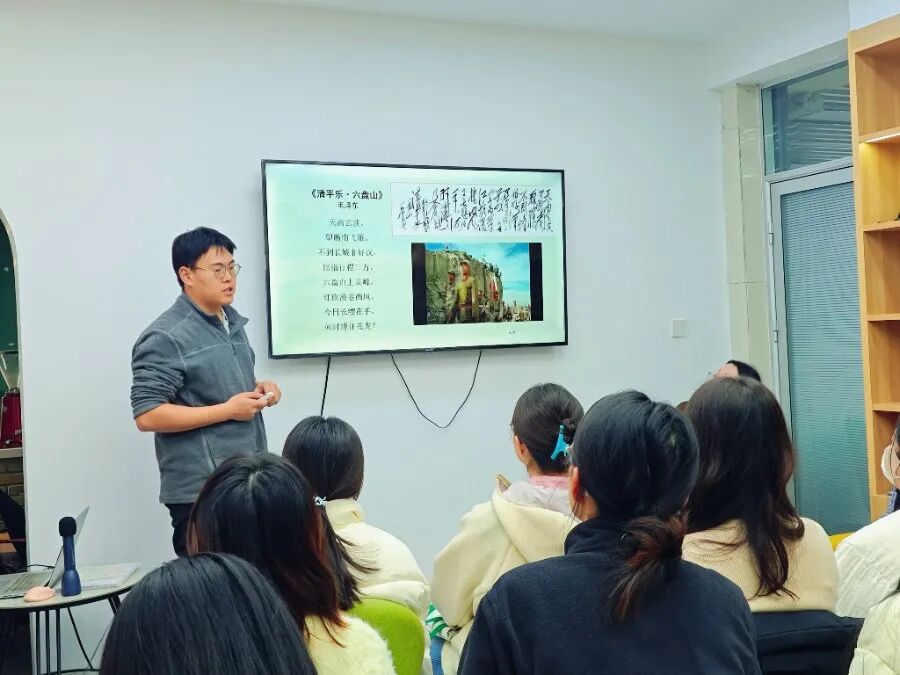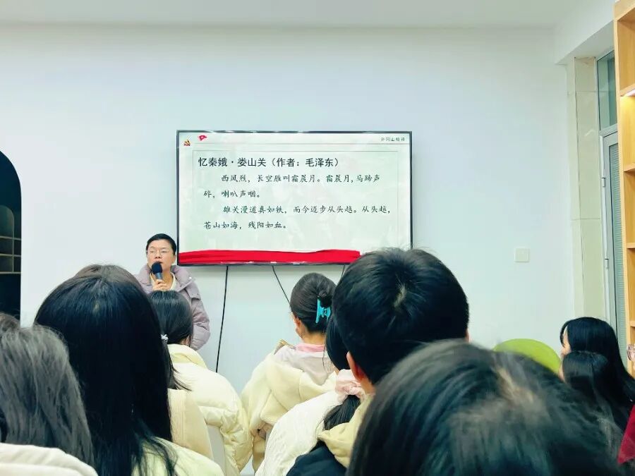 活动以红色诗词为载体,内容丰富,形式多样。各小组代表马小玲、郑剑茹、宗思远等同学依次品读了《忆秦娥·娄山关》《清平乐·六盘山》《水调歌头·重上井冈山》《青春中国》和《读中国》等经典诗词,分别围绕篇目创作的时代背景、核心思想内涵、语言艺术特色及革命精神内核展开深度鉴赏。通过逐句赏析、深情诵读、感悟分享等环节,回溯革命先辈浴血奋战的峥嵘岁月,深刻领会诗词中蕴含的赤诚初心与坚定信仰。红色诗词不仅是文学经典,更是精神灯塔。同志们慷慨激昂、深情隽永地朗诵与解析,让我们感受到了“不到长城非好汉,屈指行程二万”、“雄关漫道真如铁,而今迈步从头越”的豪迈气概;领略到了“久有凌云志,重上井冈山。千里来寻故地,旧貌变新颜”的革命热情与山河新貌;也共鸣于“不忘初心,继续前进”的时代强音与使命担当。这些红色诗词,不仅仅是文字的组合、韵律的铺排,它们是燃烧的火焰,是冲锋的号角。每一首诗词背后,都凝结着共产党人和革命先烈对民族命运的深刻关切、对理想信念的执着坚守、对革命事业的无限忠诚、对人民幸福的矢志追求。