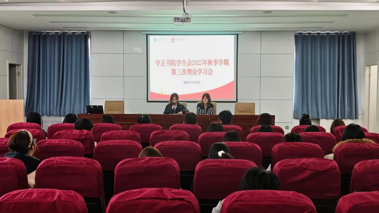 为深入学习贯彻落实“十五五”规划中铸牢中华民族共同体意识的相关要求,强化学生会思想建设与民族情怀,11月23日,守正书院学生会在怀远校区曾宪梓楼三楼报告厅开展第三次理论学习会。本次会议由学生会办公室霍雅欣、于子涵领学,学生会全体成员参与学习。