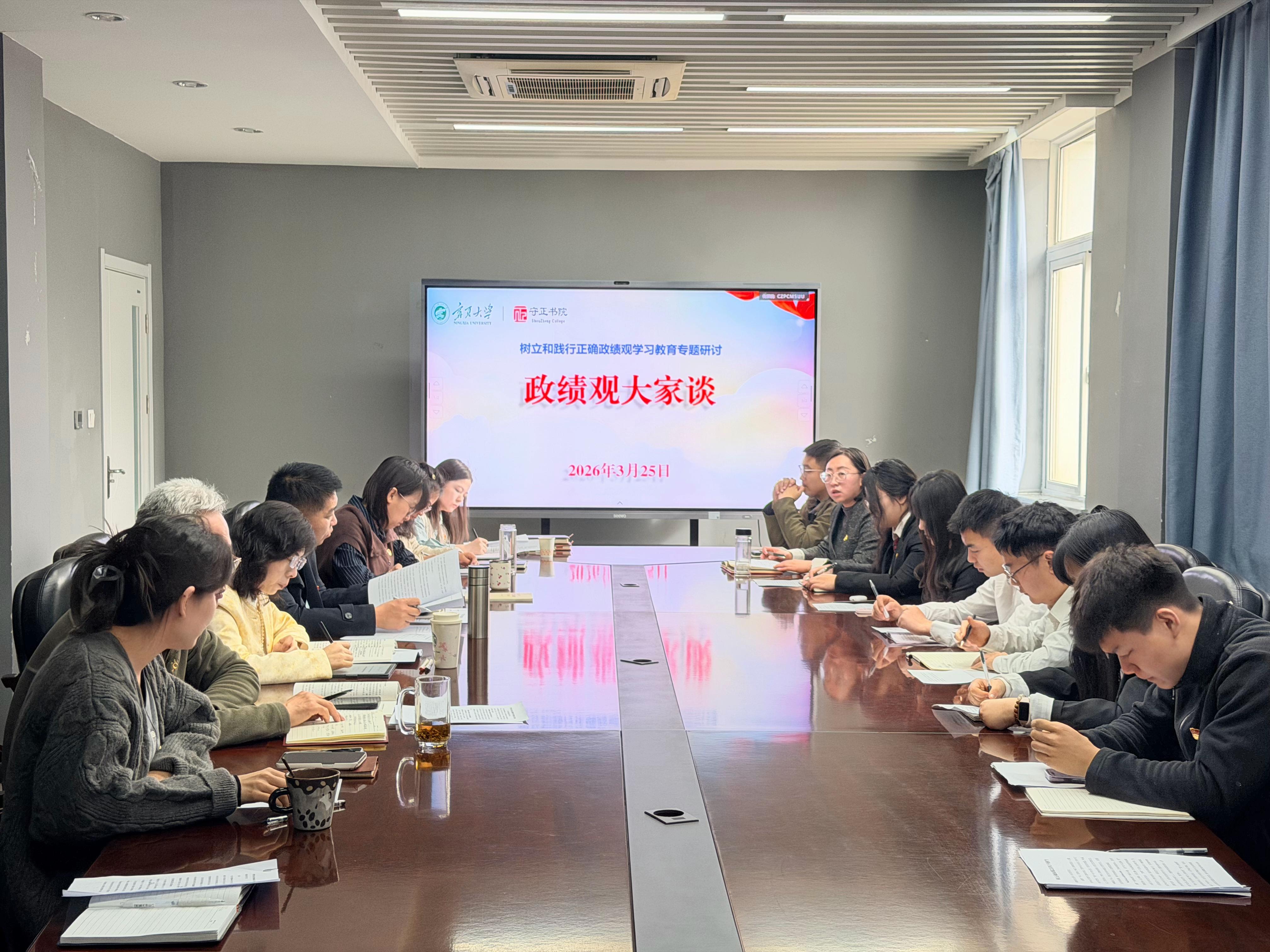 会上,与会人员集体学习了校党委书记王宏伟同志在宁夏大学党委树立和践行正确政绩观学习教育读书班暨理论学习中心组专题学习会开班式上的讲话;围绕“政绩为谁而树、树什么样的政绩、靠什么树政绩”开展集中学习与交流研讨。大家结合立德树人根本任务,从师德师风建设、学生管理服务、思政教育实践、党员先锋模范作用的发挥、校园安全稳定等工作实际,逐一交流学习心得。大家一致认为,树立和践行正确政绩观,开展树立和践行正确政绩观学习教育,要坚决摒弃形式主义、功利主义,把正确政绩观融入日常履职全过程,坚守为党育人、为国育才初心,聚焦师生急难愁盼,以实干担当提升育人质量与服务水平,推动书院各项事业高质量发展。