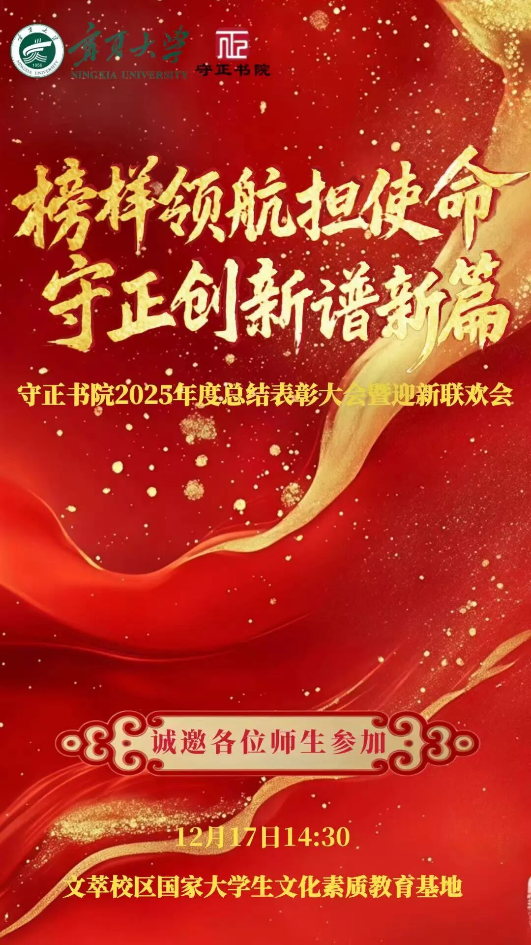 青春逢盛世,奋斗正当时。宁夏大学守正书院2025年度总结表彰大会暨迎新联欢会即将启幕!12月17日14:30,在文萃校区国家大学生文化素质教育基地,我们以“榜样领航担使命,守正创新谱新篇”为帆,既回望一年的耕耘与收获,也迎接新程的朝气与希望。诚邀每一位师生,共赴这场荣光与温暖交织的盛会!